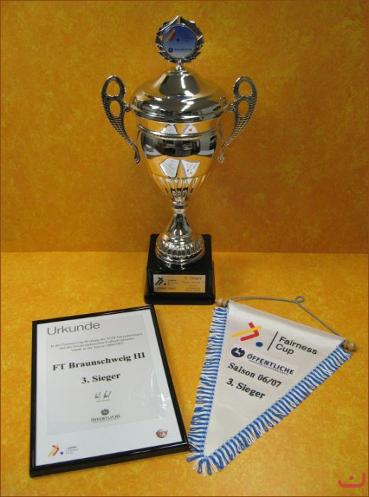 Die Freien Turner Braunschweig III wurden vom Vorsitzenden des NFV-Kreises Braunschweig, Volker Baumgärtel, zum vierten Mal in vier Jahren Fußball-Kreisligazugehörigkeit als drittfairste Fußballmannschaft im Bezirk Braunschweig ausgezeichnet und von der Öffentlichen geehrt. Bereits in der Saison 2000/01 sind die Turner unter 1241 Mannschaften in Niedersachsen Zweiter im Bezirk geworden. Ein Jahr später reichte es immerhin zu Platz 48 unter 1228 Teams und im Bezirk erneut auf Rang 2. Unser Foto zeigt (von links) Günter Reck (Öffentliche Versicherung), Mannschaftsführer Turner III Martin Kruse, Mannschaftsführer 1. B-Jugend Lukas Kierdorf und Abteilungsleiter Olaf Barnbeck.