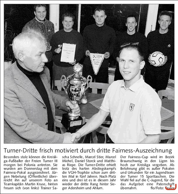 Den Fairness-Preis in der Kreisliga gewann die dritte Vertretung der Freien Turner. Insgesamt nur 30 gelbe und zwei gelb/rot Karten mussten die Braun-Weißen hinnehmen. An zweiter Stelle rangiert der FC Wenden (33/4), vor Lamme (51/1). Schlusslicht ist Veltenhof mit 75 gelben, sieben gelb/roten Karten sowie zwei Platzverweisen. rk